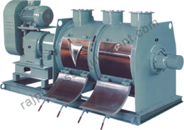 Raj plough shear mixer is a horizontal mixer with cylindrical drum and horizontally installed mixing shaft. The mixer is designed for heavy duty blending of both dry and wet material. Plough shape shovels mounted on a central shaft with its sharp ends easily penetrate through the dense powder and thick pasty mass. Extra shear can be attained by adding side mounted choppers.